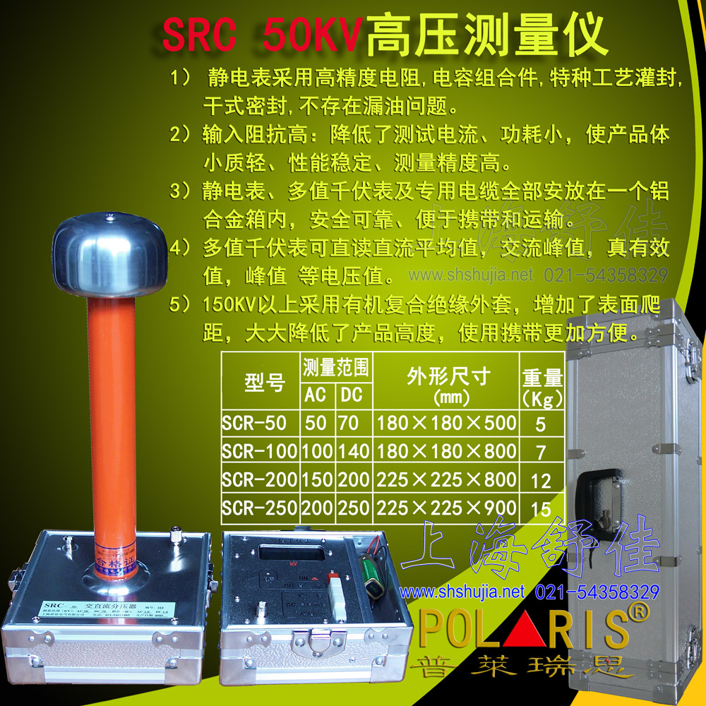 SRC高压测试仪由分压器、多值千伏表及专用电缆组成。主要用于现场交、直流高压测量,是取代静电电压表的最佳直读高压测量设备。