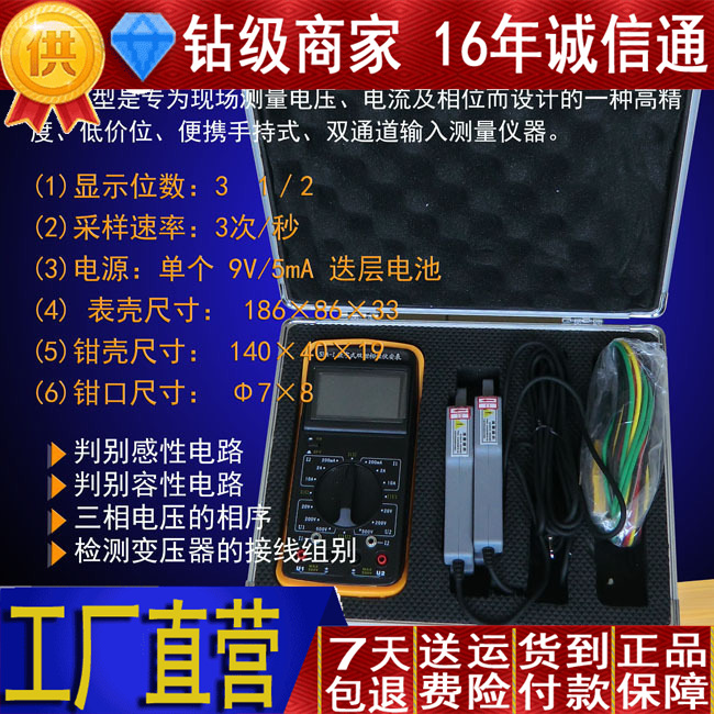 SFA-I型手持式双钳数字相位伏安表是现场测量电压、电流及相位而设计的一种高精度、低价位、便携手持式、双通道输入测量仪器。 (1)显示位数:3 1/2 (2)采样速率:3次/秒 (3)电源:单个 9V/5mA 迭层电池 (4) 表壳尺寸: 186×86×33 (5)钳壳尺寸: 140×40×19 (6)钳口尺寸: Φ7×8 (7)判别感性电路 (8)判别容性电路 (9)三相电压的相序 (10)检测变压器的接线组别